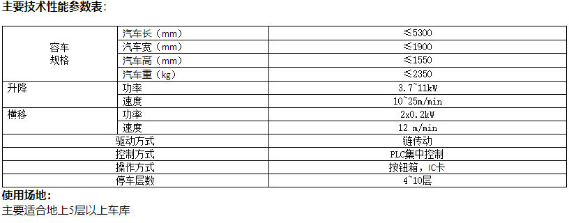 運行原理:升降機隔列設置,泊位可平移,任一臺升降機均可作周轉空位,存取車時,車位帶車進入最近的升降機內,與升降機進行車輛交換,將汽車從泊位取到升降機或從升降機將汽車轉移到泊位。