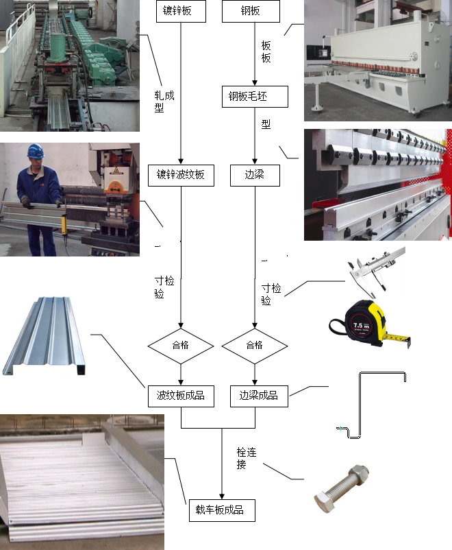 車(chē)臺(tái)板是通過(guò)鍍鋅波紋板和兩側(cè)邊梁通過(guò)螺栓連接而成,加工工藝如下圖。